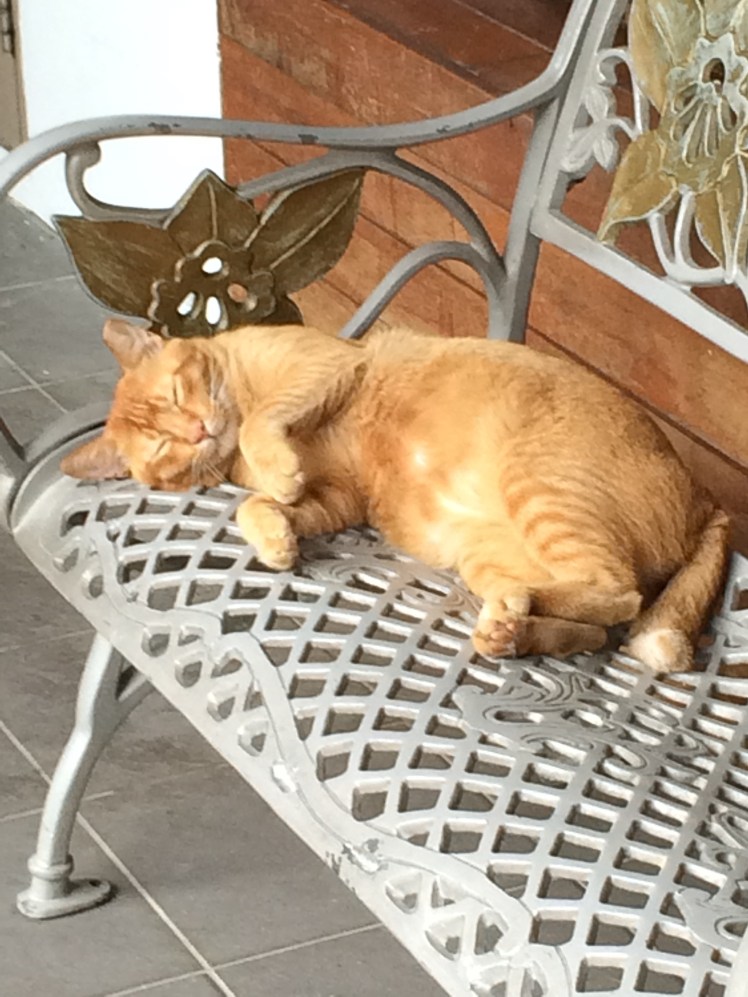 This stray cat acts as my occasional companion. She lives in our apartment block and she has a friend that my wife calls Benchie because she loves sitting on the wooden bench and greets everyone who comes by.