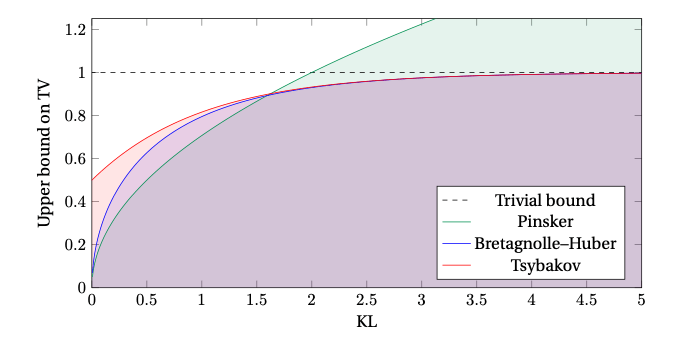 The Bretagnolle-Huber Inequality provides a bound on the total variation distance between two probability distributions in terms of their Kullback-Leibler divergence, and it is better than Pinsker’s Inequality when the KL divergence is larger than two, and it is never vacuous, as shown in this figure from [Canonne2023].
